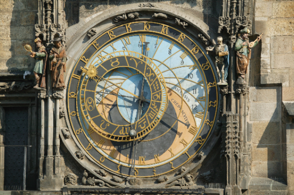 天文钟是一座精美别致的自鸣钟,分为上下两座,上面的钟一年绕一圈,下面的一天绕一圈,精美别致而又颇具古韵,可惜因二战战火的波及,现在游人能看到的钟身主要是经过战后修复的面貌。这里不仅成为了一个热门的旅游景点,更是当地人拍摄结婚照的热门取景地。每逢整点报时,12门徒像伴着钟声依次现身,尤为值得一看。