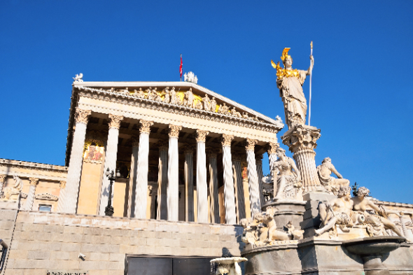 奥地利国会大厦是奥地利国会两院(众议院和参议院)的所在地。这座建筑座落在维也纳内城区的戒指路,靠近霍夫堡皇宫。国会大厦兴建于1874年至1883年,是一座希腊复兴式建筑。大厦三角檐上雕刻的是弗朗茨一世皇帝向17个民族颁发宪法的场景。国会大厦前最著名的特色是雅典娜女神雕像,她脚下的雕塑象征着当年奥匈帝国的四大河流:多瑙河、莱茵河、易北河和摩尔多瓦河。