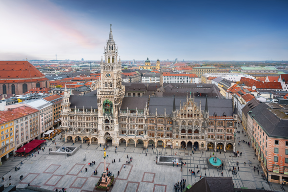 广场北面是高大的市政厅,是新哥特式建筑,钟楼高85米,上有著名的玩偶报时钟,上午11点下午5点报时钟的玩偶伴随着音乐出来展现1568年威廉五世婚礼大典的场景。 西北面很容易就能看到有两个绿圆顶钟楼的是圣母教堂,是慕尼黑的象征建筑,为哥特式教堂,钟楼高99米,建于1468年。