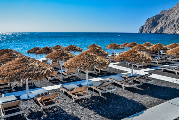 今天全天享受圣岛的迷人风光。 【5小时游艇出海含餐】可自费乘坐游艇出海,途径红沙滩和白沙滩,没有人能够抗拒珊瑚礁和水晶般清澈的海水。前往火山喷发后天然形成的奇特黑岩,被当地人称之为“印第安人之脸”。在经过“威尼斯灯塔”后,游艇驶往NEA KAMENI火山天然温泉后驻足在风平浪静的海湾供大家游泳、海钓、用餐。在游艇上除了游览参观外,还有酒水饮料免费尽情畅饮,享受当地特色的海鲜烤肉大餐,船上现场烹饪料理,免费的浮潜和海钓设备,欢快的气氛,壮丽的风景,尽情地畅游爱琴海,令您流连忘返。 【黑海滩】圣托里尼岛独特的火山地质造就了卡玛里独特的黑色沙滩。在这里沙是黑的,水也是黑的。是火山岛喷发过后的火山灰沉积下来的黑砂石逐渐形成绵长的黑沙滩,是圣托里尼岛东面颇受欢迎的度假海滩。 【活火山】当天也可自费参加当地活火山旅行团,坐船前往活火山,抵达后登上活火山观赏冒烟的火山口,还可跳入活火山海域的纯天然温泉,最后返回老码头。不参加的可以在费拉小镇自由活动。 【费拉】小镇,享受自由活动时光。您可以漫步在费拉小镇,餐厅、酒吧、各式商店林立,可以徒步前往蓝顶教堂,可以选个阳光坐落的咖啡馆,享受海风的吹拂及眼前童话般的风景。 当晚入住圣托里尼酒店。